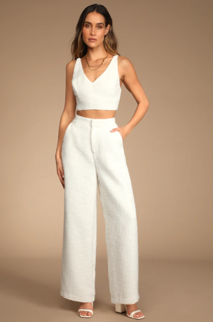 Lulus Chic and Sophisticated Ivory Tweed Wide-Leg Pants will help you transition into sunny days in style! These ultra-trendy pants are made of woven tweed and feature a high, banded waist, a flowy fit, side seam pockets, and ankle-length hems. Top button is hidden, and the fly is zippered. For a complete look, pair with the matching tank top! Click here to get this elegant piece for yourself.