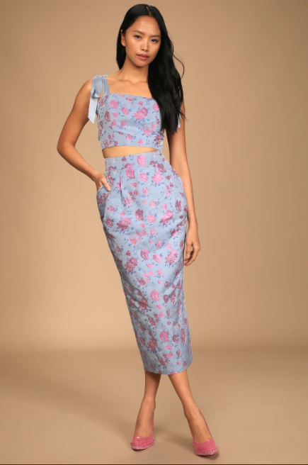 A lovely, luxe look is easy to achieve when you've got the Lulus Ellarina Light Blue Metallic Tie-Strap Two-Piece Midi Dress in your closet! This unique two-piece dress is constructed from thick jacquard fabric with metallic pink threading that creates a vibrant floral print. Set includes a princess-seamed crop top with contrasting blue satin tie-straps and a matching midi skirt with a high-rise, sheath silhouette, banded waist, diagonal side pockets, and kick pleat at back. Top and bottom have matching exposed silver zippers at back. Click here to get this pretty printy matching set.